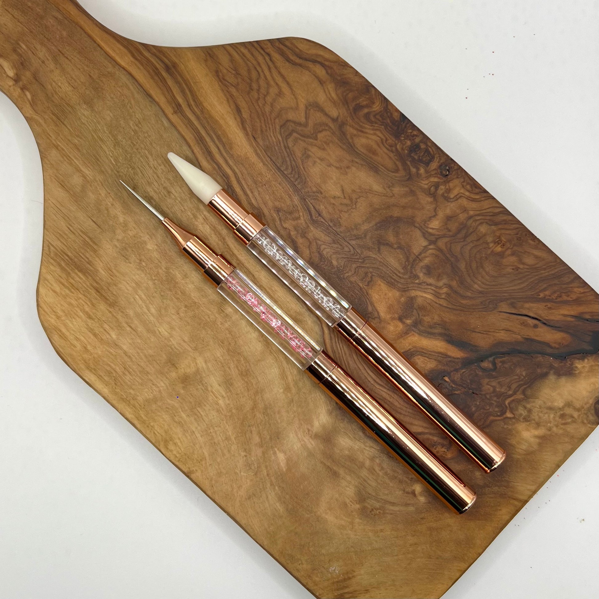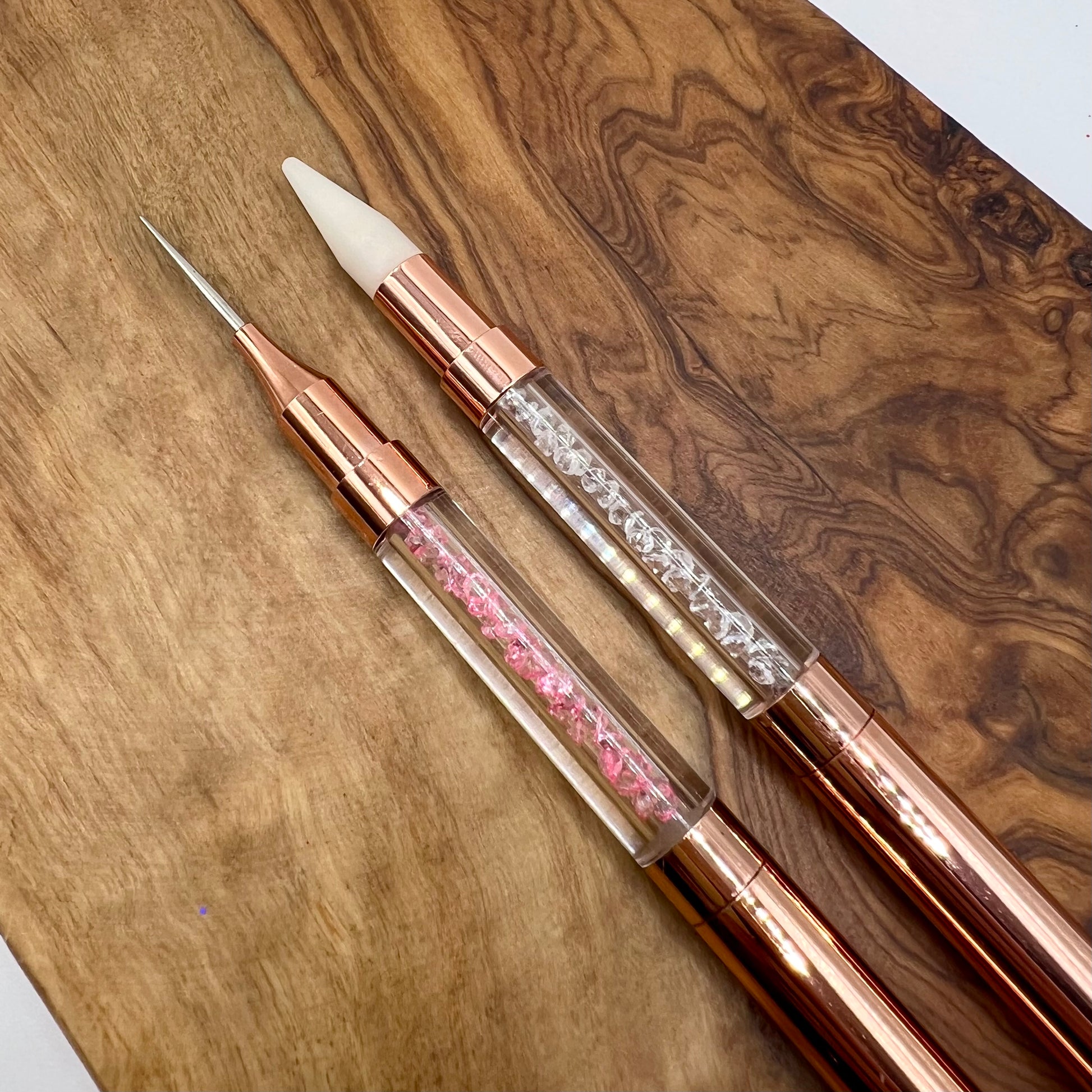 Double ended rhinestone tool with one wax side and one needle point side.